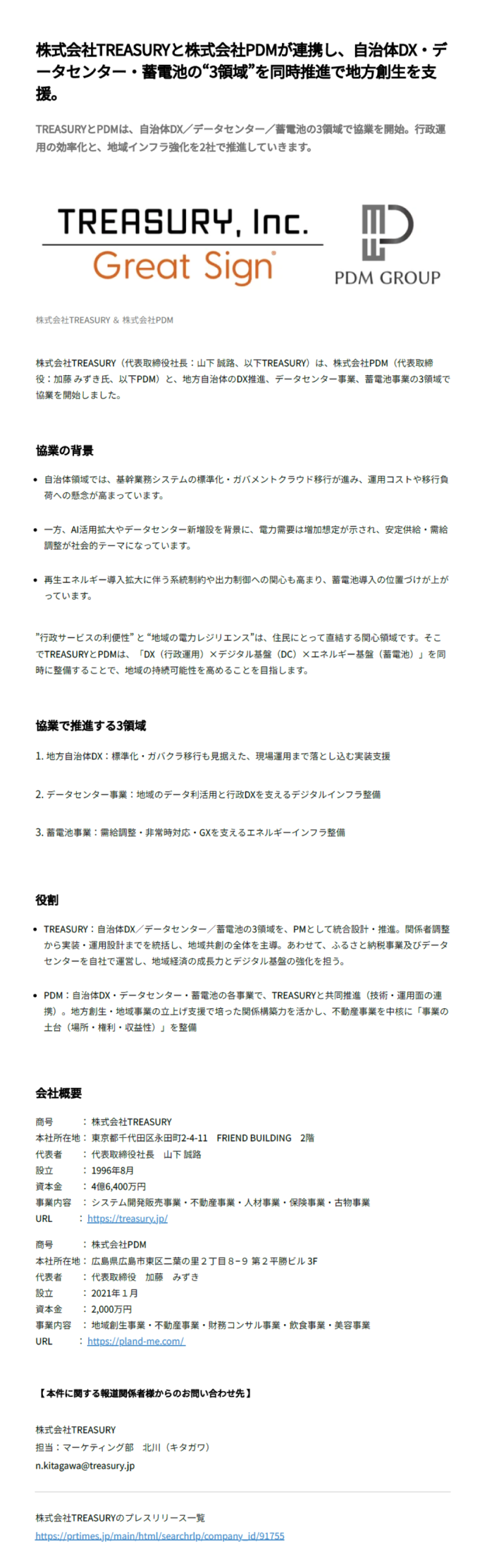 新着情報 株式会社TREASURYと株式会社PDMは、自治体DX・データセンター・蓄電池の3領域で協業開始いたしました。 2026.01.05 株式会社TREASURYは、株式会社PDMとの協業により、地方自治体のDX推進、データセンター整備、蓄電池導入という3領域に同時に取り組みます。以下、プレスリリース内容をご紹介いたします。 「SDGs宣言」を策定しました 前の記事